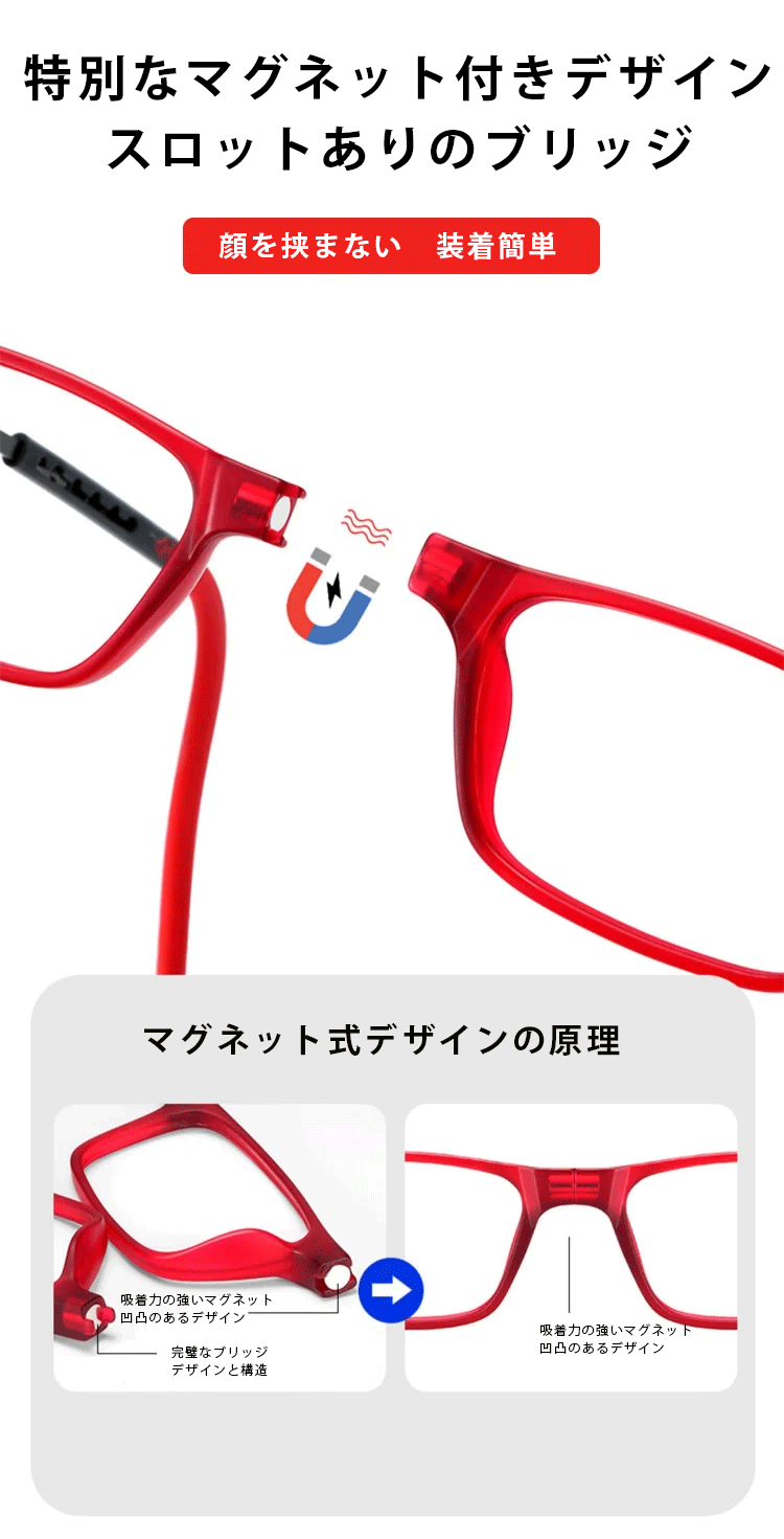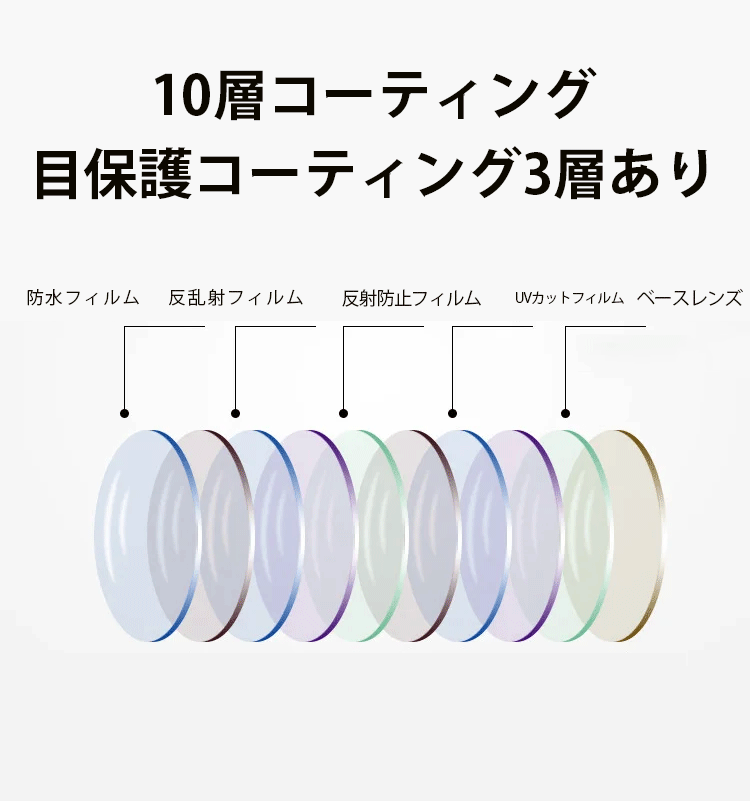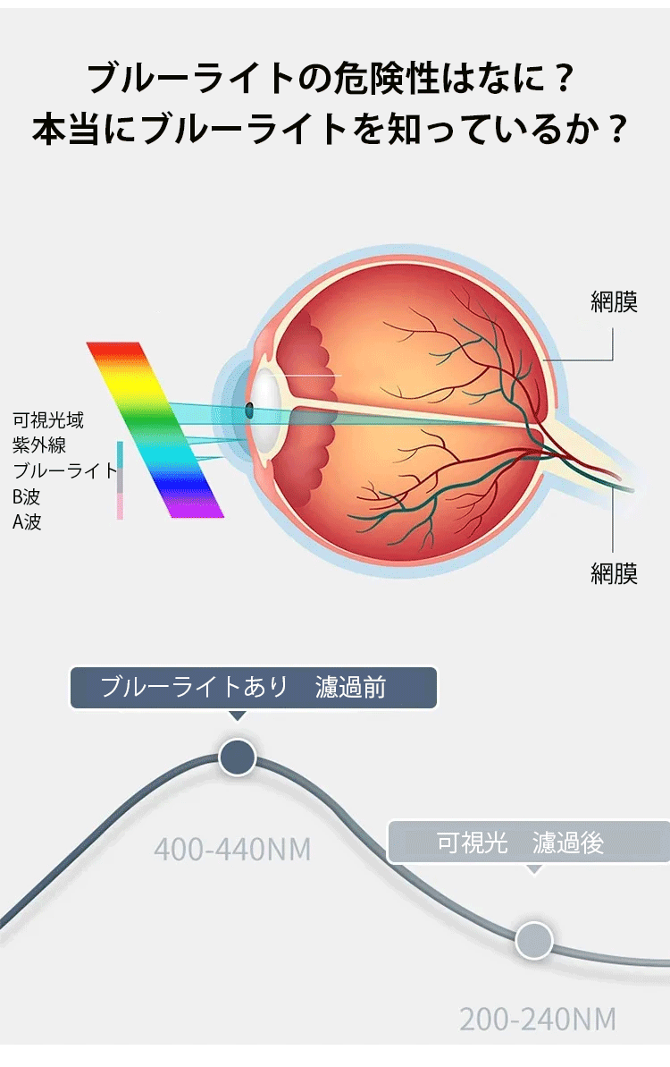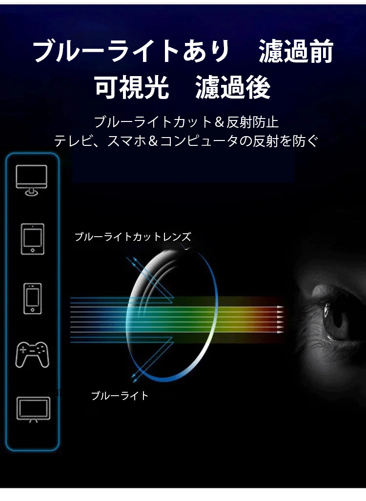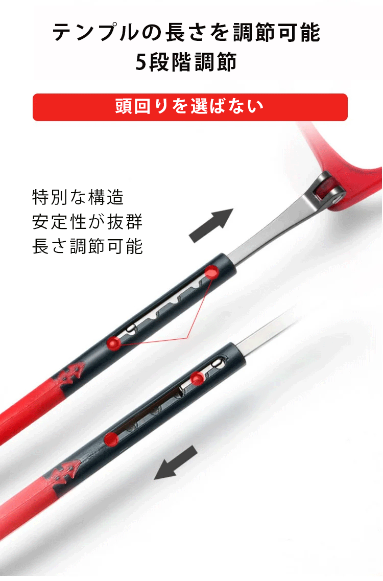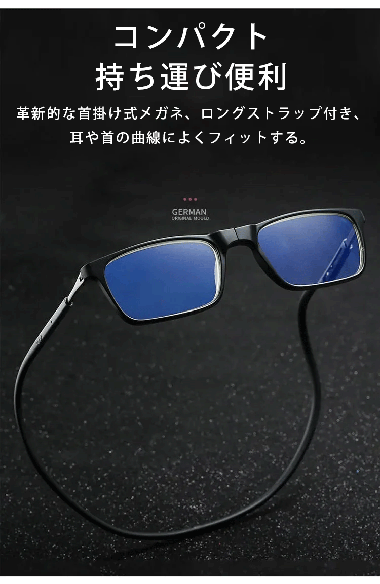 ブルーライトカット、耐キズ、長さ調節可能、快適な装着感、コンパクト